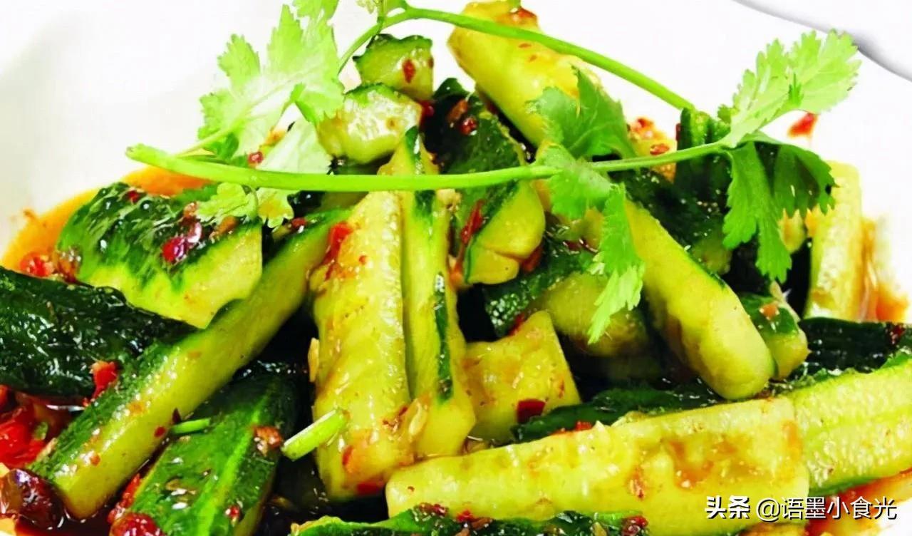 【凉拌黄瓜】:黄瓜加点盐搓揉更好的杀菌再冲洗干净拍碎切成小块,装入盘中加少许生抽,白糖,辣椒,香油,花椒油和两根香菜拌均匀之后密封好放冰箱冷藏一小时再吃口感更好更入味,是夏日必吃的凉拌菜之一,解腻又减肥,比吃肉都香。