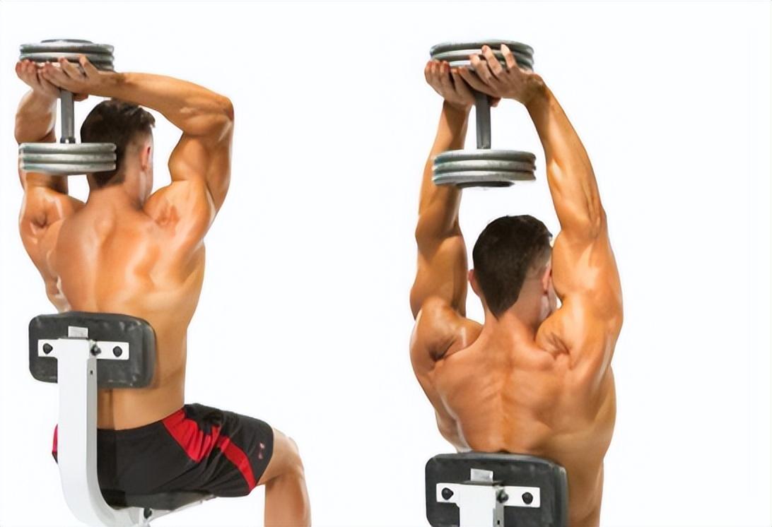 如果你的哑铃重量不够,那么你也可以做单臂的哑铃,颈后臂屈伸,注意你的大臂尽量保持固定不动,不要借助惯性和爆发力完成动作。这个动作做三组,每组十到12次。