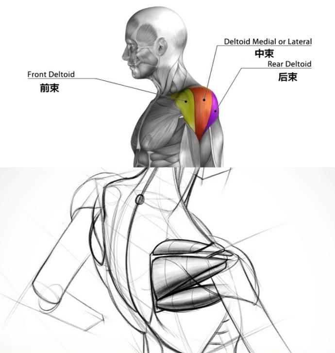 大家都知道三角肌由三个部分组成 - 前束,中束,后束(具体位置参考图1),三角肌中束更多的决定了肩部的饱满程度,强化中束好棒的动作就是侧平举,更多人去选择用哑铃做侧平举,当然也可以用绳索+把柄负重做侧平举,也可以用小杠铃做侧平举,让动作更多样化。