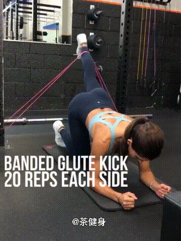 肘部支撑地面,单膝跪地,另外一条腿顶着弹力带往上踢。