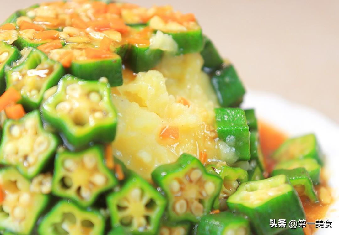 8.再取一个盘子盖住,把土豆泥和秋葵倒扣在盘子里,一个漂亮的秋葵绣球就做好了。喜欢原汁原味的就可以直接食用了,当然,也可以浇点汁。