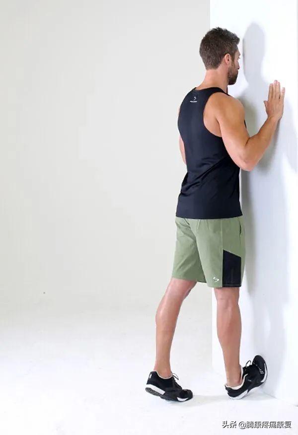 双手扶在墙上,做一个深弓箭步姿势,后侧腿是被拉伸的一侧。保持后腿完全伸直。向前扶墙俯身。不要让后腿的脚后跟抬离地面。保持30秒。3、腓肠肌贴墙伸展