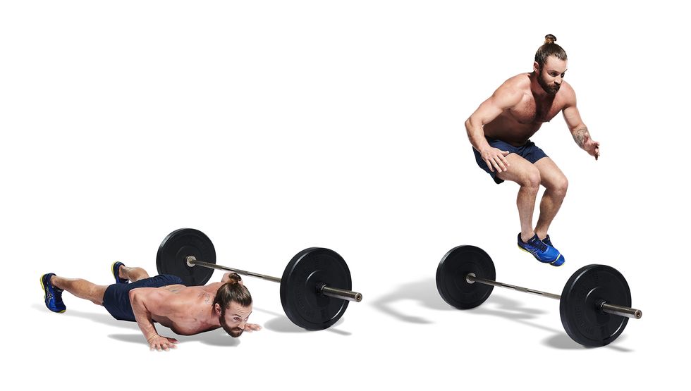 将你的杠铃放到地板上,但是不要停下训练的节奏。站到杠铃的一侧,双脚向后跳并伸直,双手顺势支撑到地板上,并屈肘向下放低身体,直到你的胸部接触到地板,然后站立起来,用力跳到杠铃的对侧,要尽力向上跳起,双脚要高高离开地面,然后接着做俯卧撑。