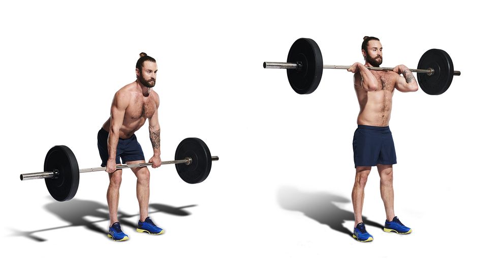 在前面的动作后一次下蹲后,双手抓握着杠铃放低到臀部的高度,然后屈髋将杠铃继续向下放低到膝盖的位置,然后再屈膝,将臀部向后推,接着双手用力向上拉杠铃,接着旋转你的手腕,用力托住杠铃杆,将杠铃托在肩部的位置。