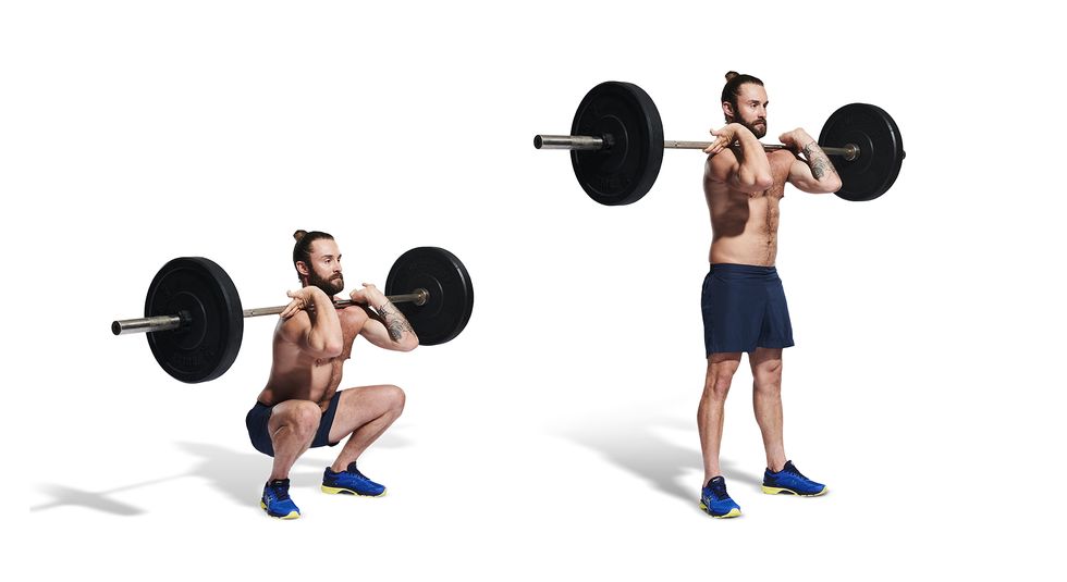 双腿打开与肩同宽站立,双手屈肘将杠铃托举在胸前的锁骨位置,然后将双手的肘部抬高,将杠铃地固定在自己的肩膀位置。将上身保持挺直,然后把臀部向后推,屈膝将身体向下蹲,直到大腿平行于地面。然后从脚后跟发力,将身体站立起来回到起始位置。