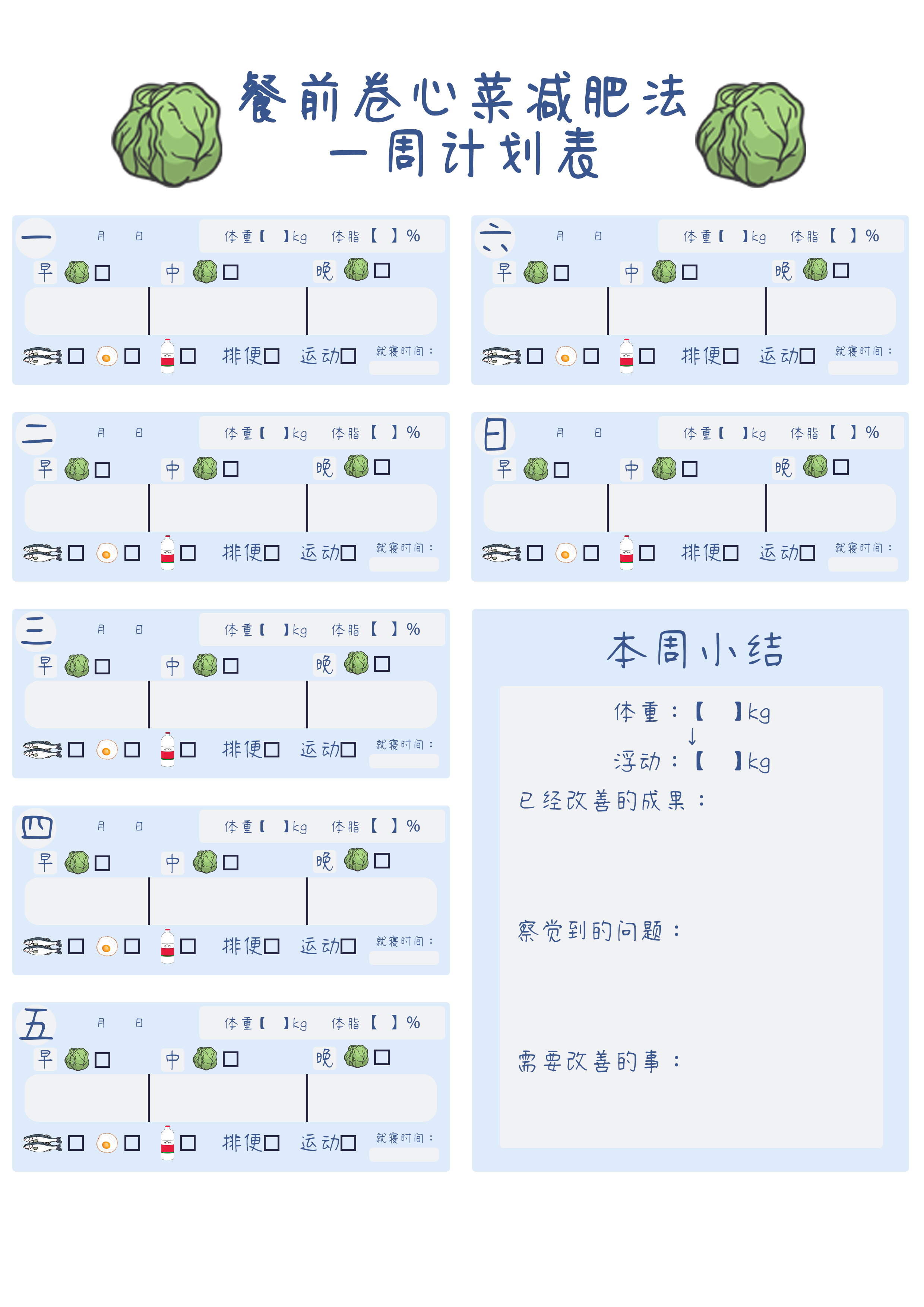 其实有各种各样可以吃的东西说是餐前卷心菜减肥法,绝不是只吃卷心菜!能代替卷心菜的其他蔬菜都是可以的。后面会出一期“食品替换表”让大家有更多的选择,你看了就会明白,可以用菠菜、西红柿、黄瓜等做替换。另外,其他蔬菜连同卷心菜一起吃也不错!