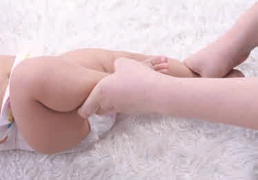 1、双手贴在宝宝的膝关节,两拇指按在宝宝的腓肠肌上,使宝宝双腿伸直。
