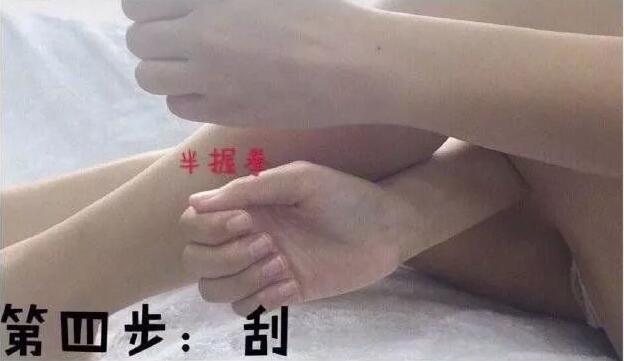 两手呈半握拳状,从小腿下方由下往上向膝盖位置刮。(重复2分钟换腿)