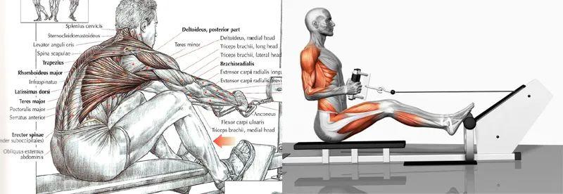 而从动作模式相似度来看,坐姿划船会更类似杠铃划船。它们都是双手同动、双脚支撑、膝盖微屈的模式,你可以把坐姿划船作为学习和过渡到杠铃划船的手段。