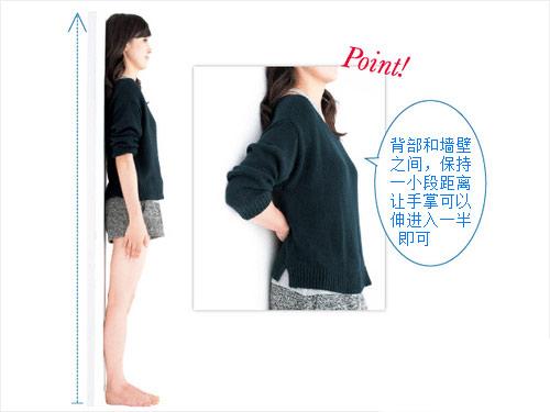 1.靠着墙壁,挺直腰背站着。肩膀、臀部、小腿肚,还有双脚同时贴着墙壁,看看脖子是不是保持笔直,肩膀有没有倾斜。