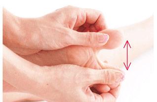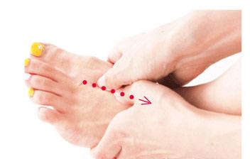 5.按照由趾缝到脚踝的方向,用两手的拇指用力推按脚背。从第一个指缝开始,按顺序依次按压4个指缝。
