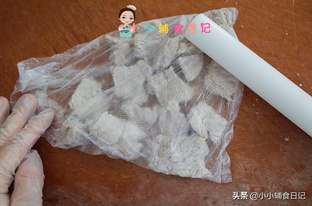 用厚一点的保鲜袋,把那个猪肉放进去,用擀面杖把它敲扁