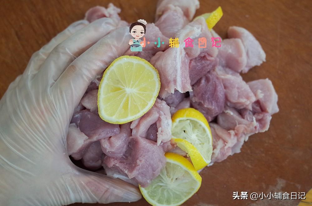 把半个柠檬切片,跟猪肉一起腌一下,我们可以用手抓几下,大概腌渍15-20分钟左右,夏天要放冰箱。