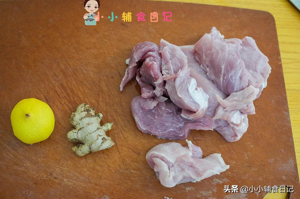 准备好瘦肉,姜片,还有柠檬,就这三种原料。好选里脊肉,因为筋膜会比较少,如果真的没有也可以选择猪大腿肉那种瘦肉多的部分。