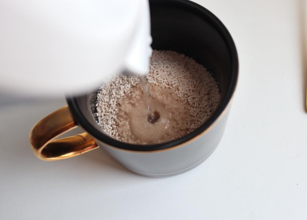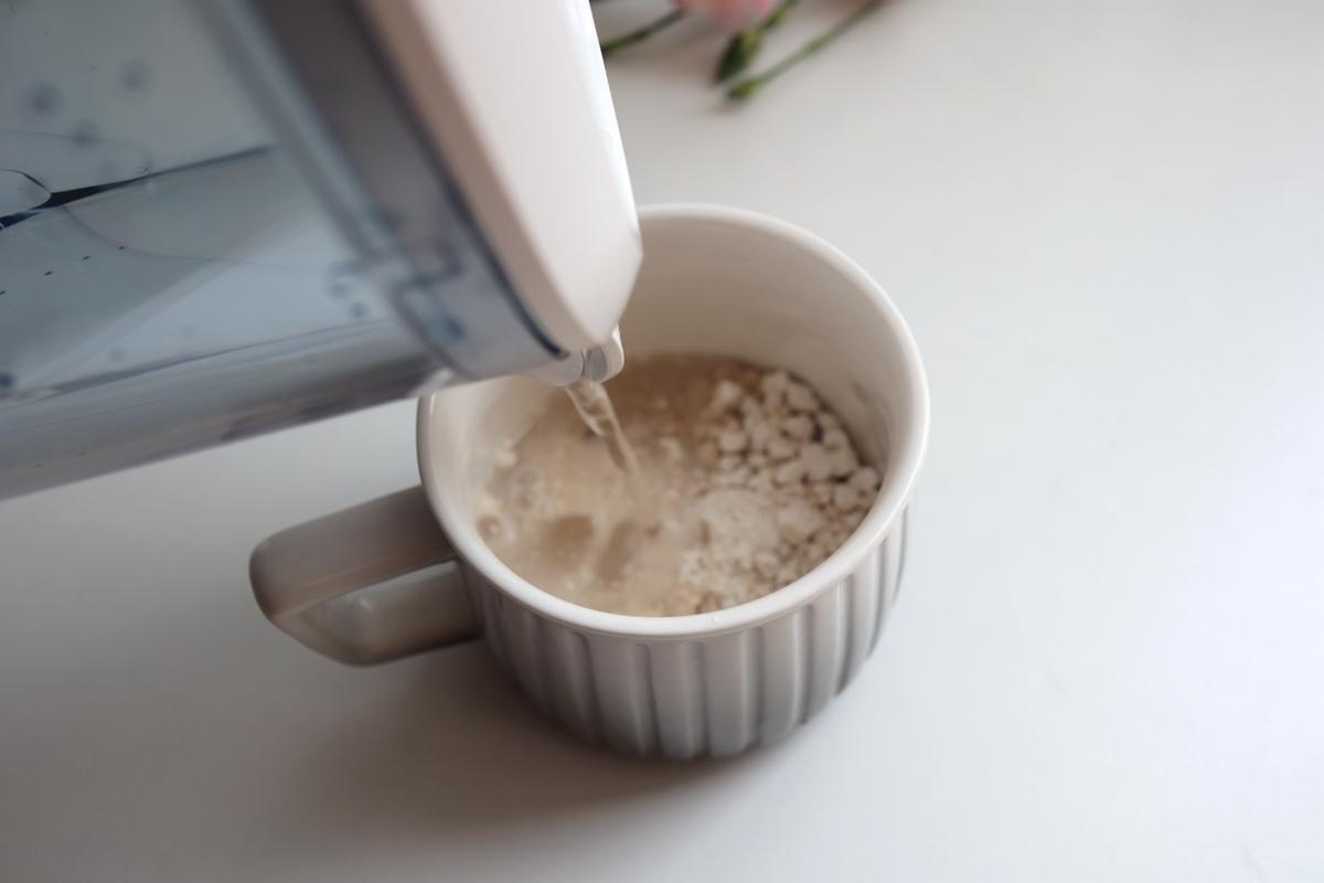 2. 莲子藕粉倒入杯中,用少许凉水泡融化,千万不要多;