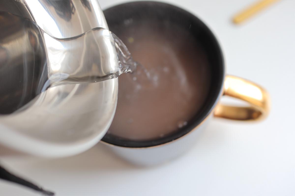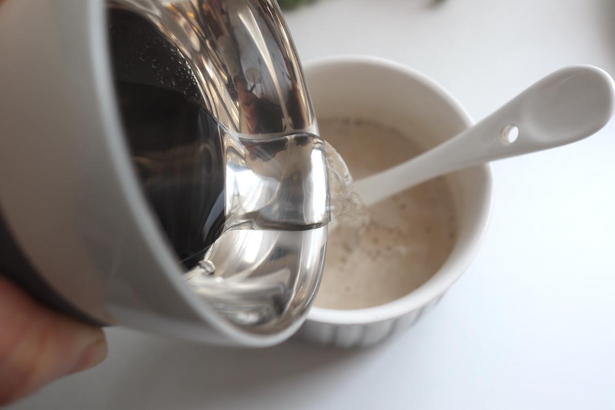 4. 将沸水倒入碗中,一边倒一边用小勺搅拌,直至透明状;如果没有杯子少或者水温不够,葛根粉没变色可以倒入锅中去熬煮。
