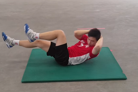 仰卧在地面上,双手放在脑后,头部和肩膀微微抬离地面。弯曲左膝盖靠近胸前,同时向左扭转身体,用右手肘去碰左膝盖,然后还原,换另一边。每边各一下为一个动作,20个动作为一组。