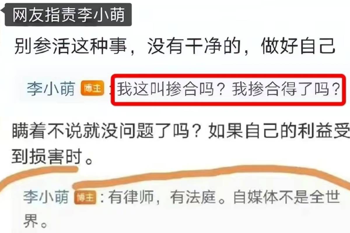 大部分人第一想法肯定是李小萌在评论大S和汪小菲事件,文字中表达的意思也是嘲讽汪小菲。李小萌在这个节骨眼上发表这样的言论目的可想而知,想借着自己曾经的过往和明星夫妻的流量为自己提升热度,方便以后直播带货。不少网友劝她“别掺和”,而她的回应却是“我掺和得了吗?”“有律师、有法庭,自媒体不是全世界。”