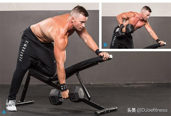 单手握住一个哑铃。身体前倾,另一只手放在长凳上(或其它固定物上)。让你的哑铃从肩膀上垂下来,但不要放松。相反,把你的肩膀向后拉。稍微弯曲你的膝盖,收紧你的腹肌,稍微拱起你的下背部。弯曲手臂,将哑铃向上拉到肋骨的一侧。用手肘引导,保持手腕伸直。不要让你的下背部旋转。慢慢伸展手臂,重复上述动作。每只手臂重复同样的次数。你也可以把单膝放在长凳上做这个动作。动作优势: