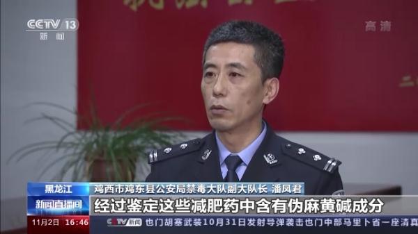 鸡西市鸡东县公安局禁毒大队副大队长 潘凤君:经过鉴定这些减肥药中含有伪麻黄碱成分,因为根据《危险化学品管理条例》《易制毒化学品管理条例》,伪麻黄碱是受有关部门管制的药品,也是制作冰毒的原材料之一。