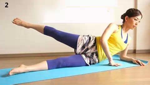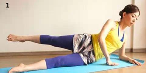 Step 1. 用手肘撑起上身,两腿保持伸直的状态。上面的腿慢慢向后斜约45度抬起,与骨盆同宽。