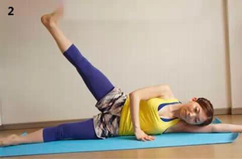 Step 1. 横卧在垫子上,头枕着贴近垫子的手臂,另一只手臂放在胸前。两腿从大腿根到脚尖都要绷直,直直地抬起靠近天花板的腿,2腿呈90度角。