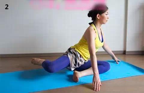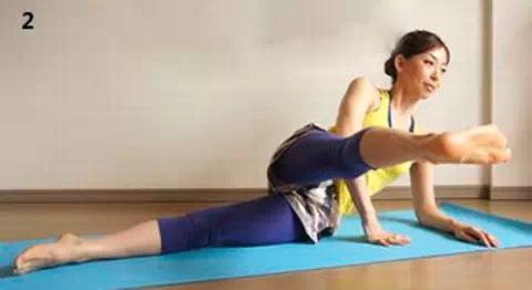 Step 2.上半身稍稍向前倾,靠后的脚稍微悬浮于垫子之上,慢慢呼吸3次。另外一只脚也是一样。可用两手的手指尖支撑一下身体,以免失去平衡倒下。