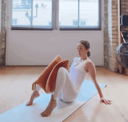 - 呼气,收紧核心,双腿屈膝向后;