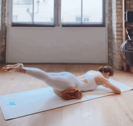 - 呼气,核心收紧,脚背绷直碰两次;
