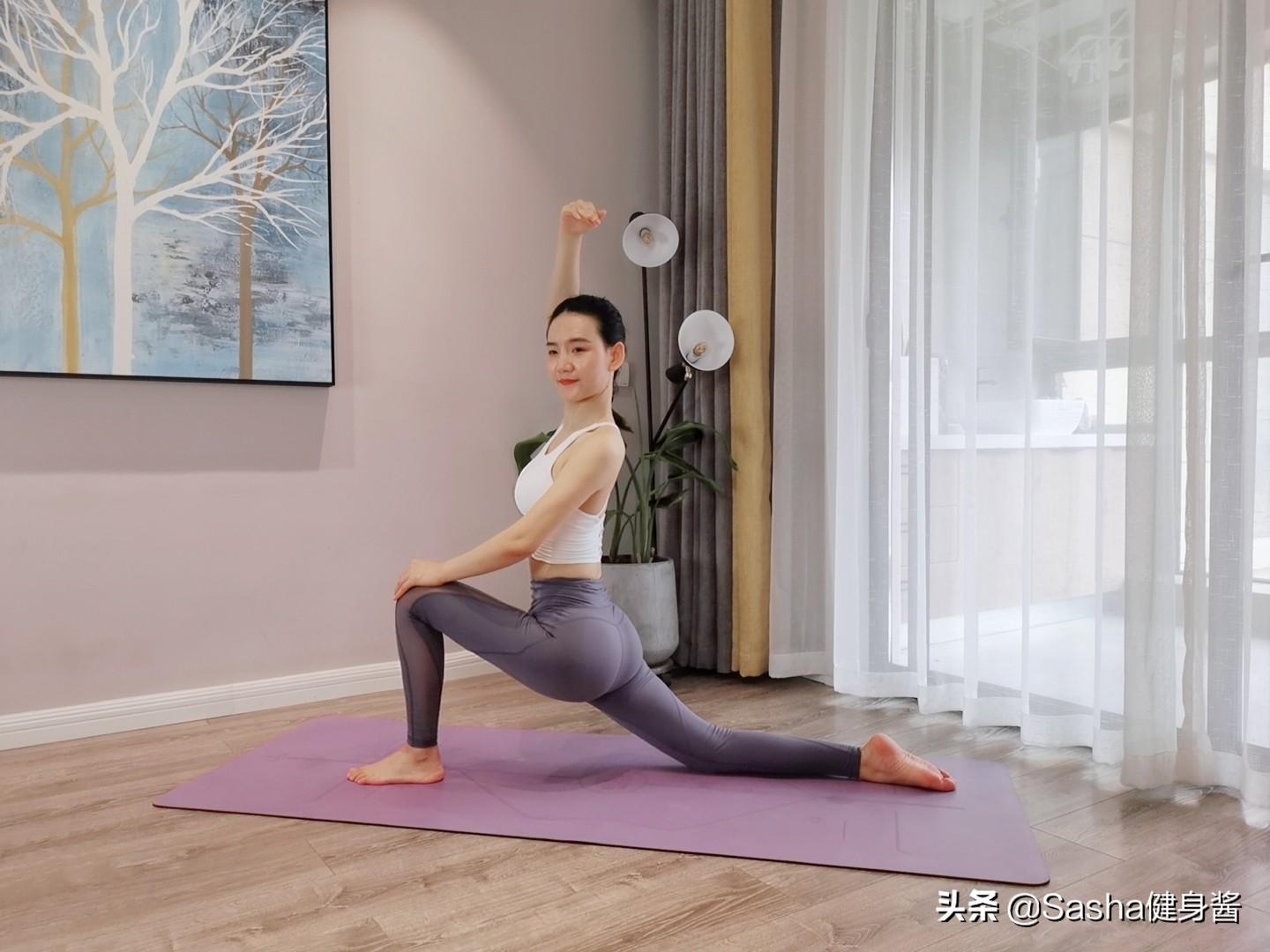 主要锻炼大腿与小腿,以及臀部的肌肉群。双手叉腰,保持上半身直立,一只腿向前成弓步状态,另外一只腿膝盖与地面接触,做完之后换另外一条腿,这组动作做3分钟左右,能够感觉到腿部与臀部肌肉拉伸。