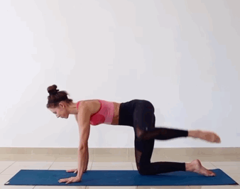 来到四足支撑位,注意核心启动呼气,左腿屈膝,髋部向外展吸气还原,重复10-12次后换另外一边体式07、四足支撑髋外展