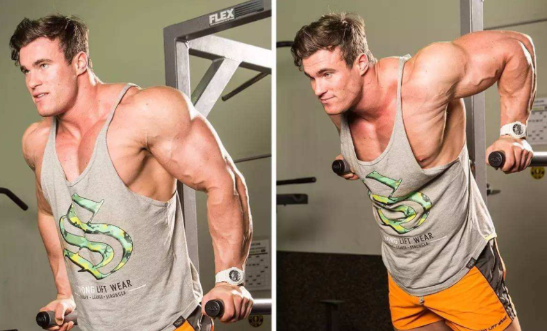 双杠臂屈伸很多人都会做,就是身体用两个手臂撑起来,双脚离开地面。在双杠上,两只手臂弯曲,上身体向下降,然后手臂和胸肌发力,让身体再撑起来。