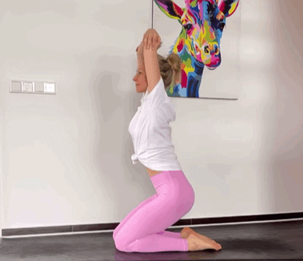 双膝跪地进入金刚座吸气,双手屈肘举过头顶呼气,收紧核心骨盆顺时针画圈10-15次