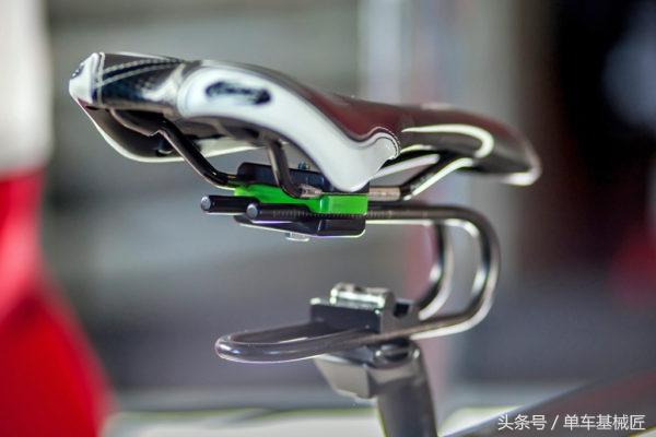 支撑鞍座的板簧是一个简单的弹簧钢圈,额定的大骑行重量可以达到150kg。由两个金夹具和一颗固定螺丝来固定鞍座。通过调整上下两个夹具之间的相对距离,来调整板簧的刚度,更软或更硬。