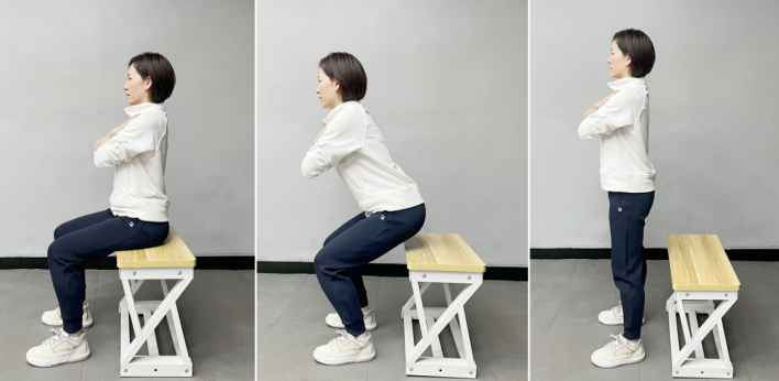 首先准备一把座位高度约为43厘米直背椅子或高箱和一个秒表(或者计时器)。如图1所示,受测者坐在椅子的中间部分,双脚平放在地面上,双臂在胸前交叉。开始测试时起身形成完全站立的姿势,然后再恢复到完全坐姿状态。得分为30秒时间内完成站立的次数。