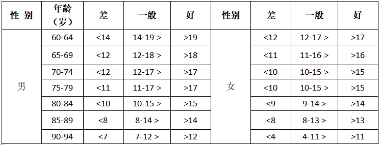30秒坐站测试评价标准如表1所示,不同年龄段男女达标次数存在差异。一般情况,男性老年人在19次以下,女性老年人在16次以下,则说明腿部肌肉力量开始出现衰减,需要做些下肢力量的训练。