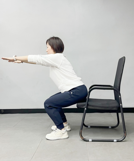 坐椅深蹲动作要领如图2所示:座椅高度与膝盖高度齐平,站在椅子前方约半脚掌宽度的距离,两脚分开,与肩同宽,两臂前伸,膝盖对准脚尖方向朝前。下蹲时,速度缓慢,吸气,腰背挺直,腹部收紧,两手前平举,两眼目视前方。下蹲到大腿与地面平行时,身体重心保持在脚掌中央,臀部低于膝盖,在保持身体平衡的情况下,膝关节尽量不超过脚尖,停留2秒。呼气,起身站直。