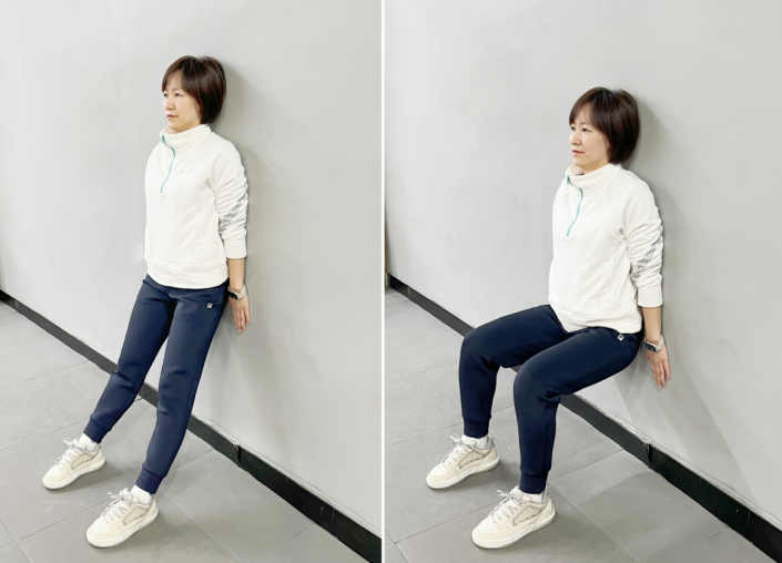 靠墙深蹲动作要领基本同坐椅深蹲,如图3所示,在靠墙深蹲前,人与墙壁的距离为两个脚掌的长度,上半身直立,背部靠紧墙壁,两臂自热伸直,掌心朝后贴于墙壁。当膝盖下滑至大腿与地面平行时,停留2秒,呼气,腿部伸直,背部沿墙壁上滑至站立位。