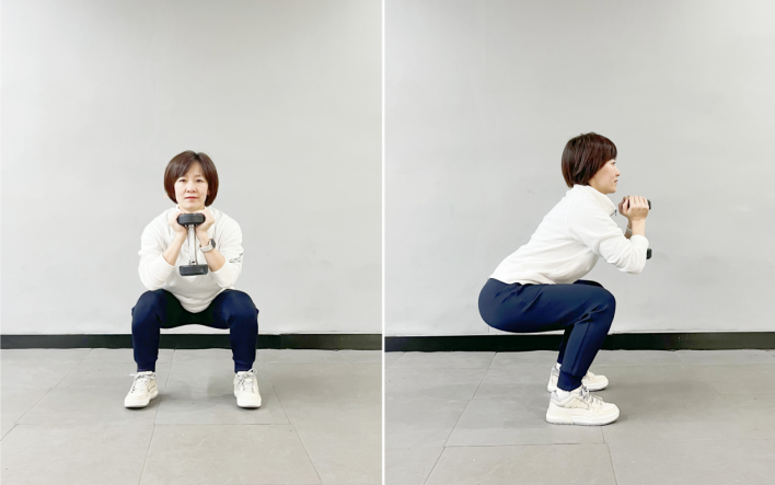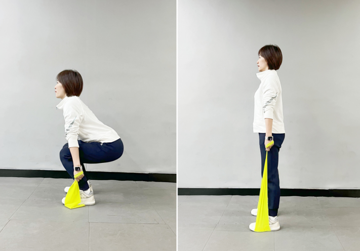 负重深蹲动作,在徒手深蹲的基础上,增加弹力带或者哑铃进行抗阻训练,具体如图5和图6所示。