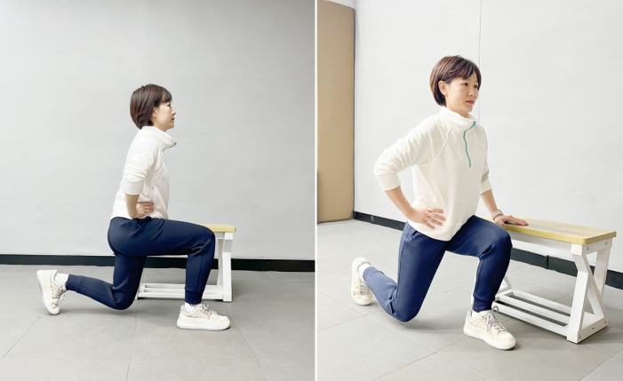 动作要领如图11所示:双脚与髋同宽,一侧脚向前迈一大步蹲下,使前侧腿3个90°(踝关节、膝关节、大腿与身体),后侧大腿垂直地面,膝盖略微抬离地面,双脚尖朝前,膝盖对准脚尖,耳肩髋一直线,核心绷紧,躯干垂直地面。动作过程中,下蹲呼气,保持弓箭步蹲动作2-3秒后,吸气还原,换另一边腿,动作相同,方向相反。