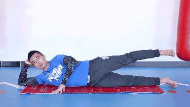 侧躺,右手枕于头下,左手撑在身体前方,双腿并拢屈膝,慢慢抬起左腿,到达高点后,停留3秒钟再慢慢落下。