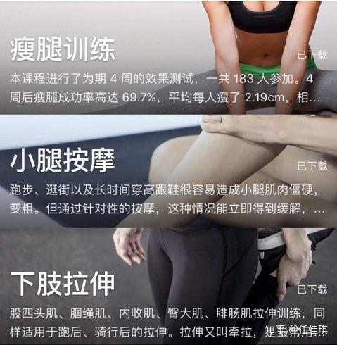 低门槛入门级别,推荐《瘦腿训练》、《小腿按摩》、《下肢拉伸》