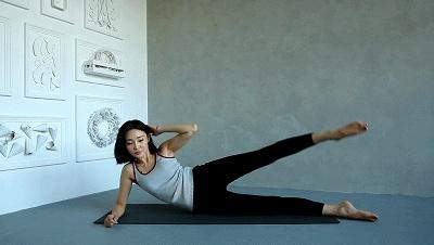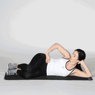 动作要领:侧躺,右手枕于头下,左手撑在身体前方,双腿并拢屈膝,慢慢抬起左腿,到达高点后,停留片刻再落下。