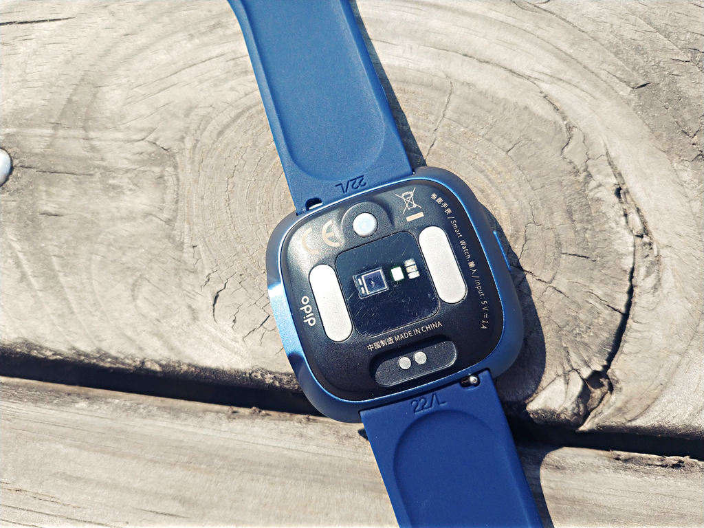 背面则是传感器和接口的分布位置,可以看到设置了3个LED和4个光电监测设备,因为采用了专业级的G-sensor传感器,并结合了双探头传感器、ECG+PPG混动导联技术、FITBLOOD 3.0血压静脉算法、以及HRF心率融合技术等,可以的对运动数据、心率、血压、心电、体温、血氧饱和度等指标进行监测。