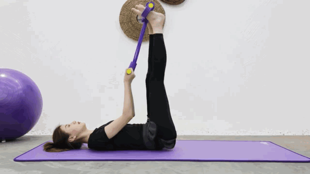 动作规范:首先把身体放平,躺在瑜伽垫上,使用拉力器,双腿向上抬起,注意把握动作速度,不要太快,双腿抬到与地面呈90度垂直,就可以缓慢放下。这个动作是帮助锻炼者瘦腿的,每天4组,每组30次。