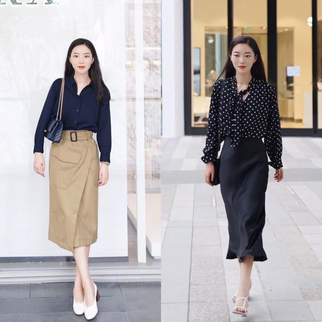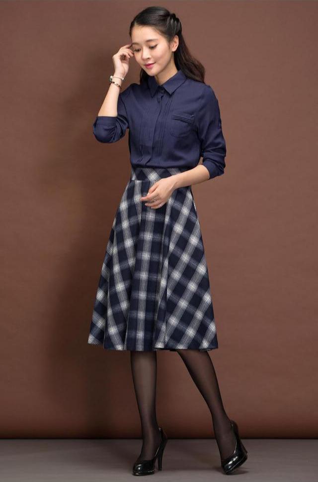 即便在气温凉爽的秋季,我们也是可以穿衬衫和裙子的喔,不过要穿长袖长裤的喔,这样穿才会更加保暖呀。修身长袖衬衫搭配格纹A字中长裙,看起来既休闲随性又复古优雅,A字裙的设计正好可以遮住过宽的胯部和臀部,而且面料的挺括性也要能支撑起A字裙摆喔。