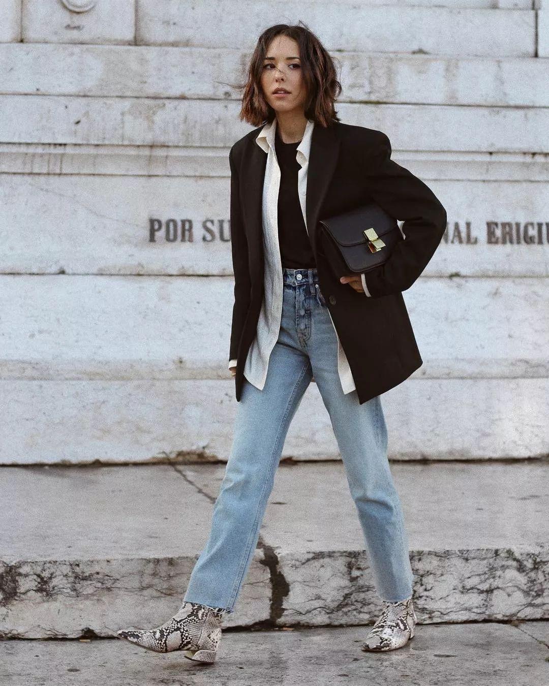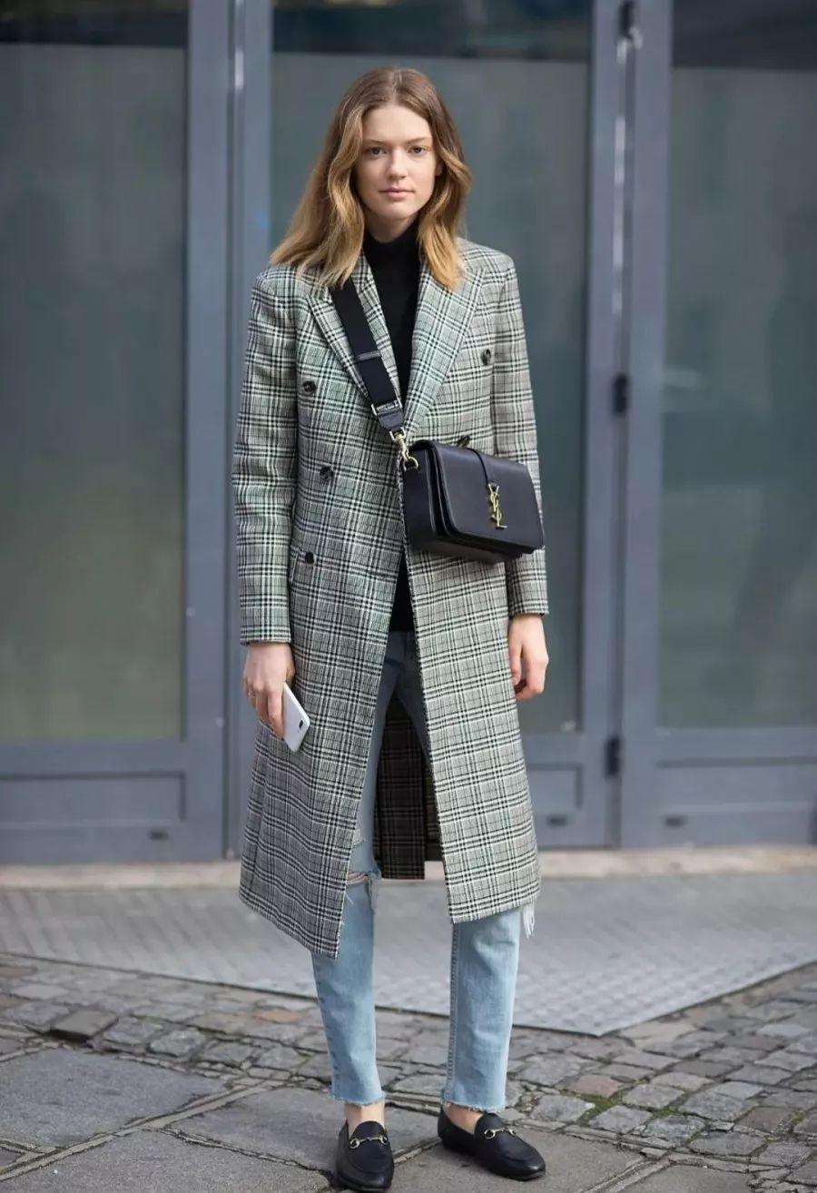 等后面天气越来越冷的时候,我们就可以把毛呢大衣穿在身上啦,毛呢大衣的面料既厚实又不会过分臃肿,材质的挺括性也强,可以从视觉上很好地起到修饰上半身的作用。毛呢大衣里面再内搭一件黑色的薄款针织衫,下半身搭配一条牛仔裤,整体上看不仅保暖还很显瘦。