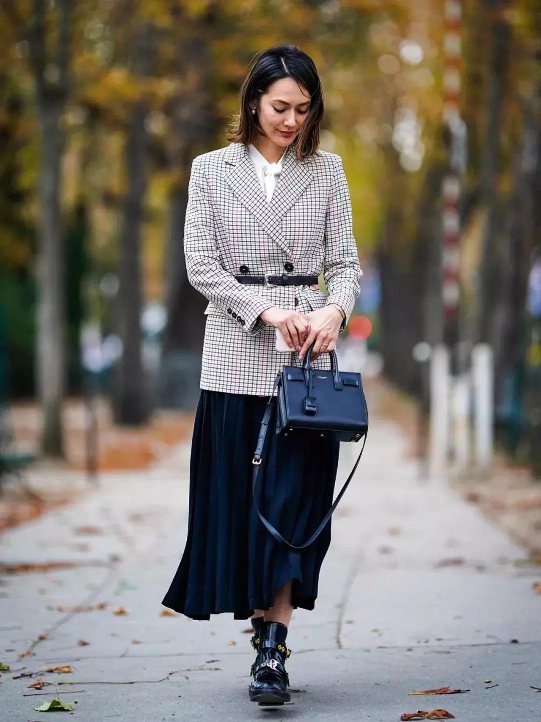 不管是什么适合,哪个季节,格纹元素都是时尚界永恒的经典。在秋天,里面穿一件白衬衫,外面叠穿一件中长款的格纹外套,下半身穿一件黑色半身裙,这样的穿搭本来是很难显现腰身的。但是,我们可以通过在腰部系上腰带,塑造出纤细的高腰线,展现出凹凸有致的曲线美,从而避免显胖显壮。并且,衣服挺括的面料也可以起到遮肉显瘦的果喔。