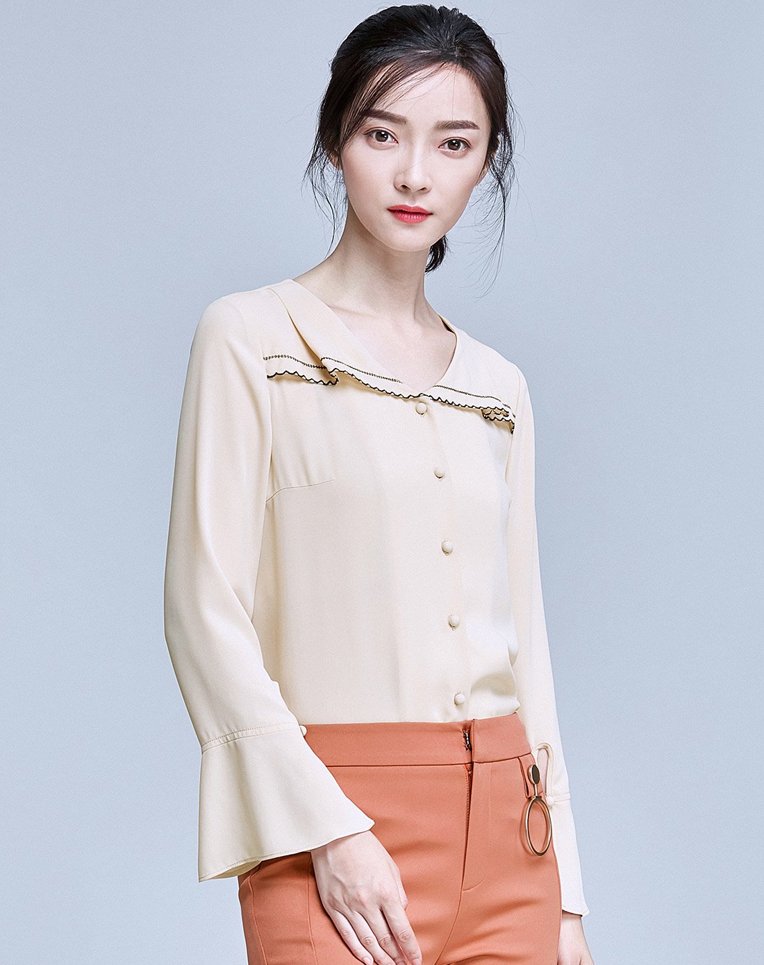推荐穿搭look:喇叭长袖衬衣+休闲铅笔裤