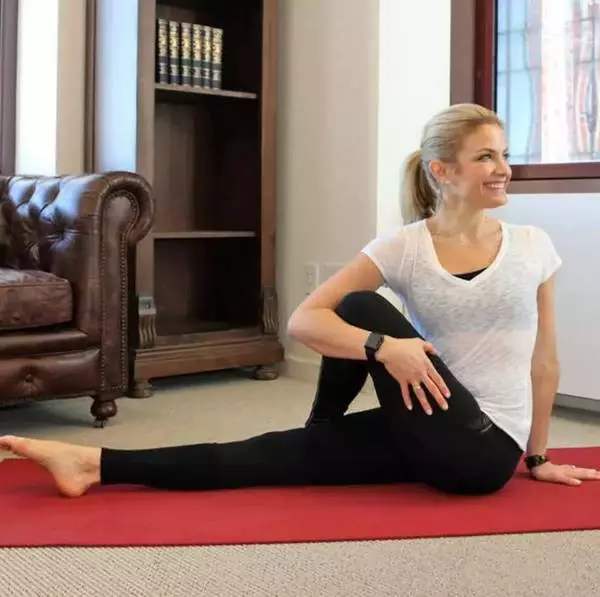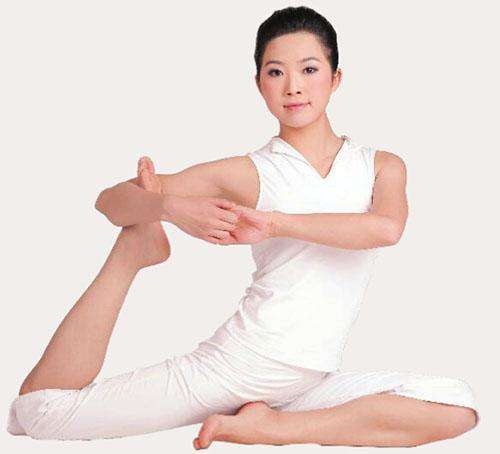 呈现坐姿,左腿弯曲膝盖,让脚掌抵在右腿的大腿内侧。右腿大腿贴地,小腿竖直向上,脚尖绷直。右手揽住右脚脚面,放在手肘内侧,左右勾住右手,用力做牵引。身体躯干挺直,眼睛看向前方,保持体式。